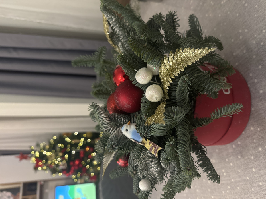 A tabletop Christmas arrangement features green pine branches adorned with red and white ornaments, glittery gold accents, and a small, light-blue bird figurine
