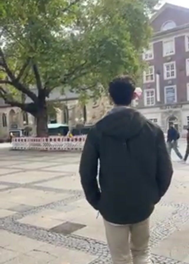 A man in a green jacket and light-colored pants walks across a plaza paved with square stone tiles interspersed with rows of cobblestones. His back is to the camera. He walks towards a large tree and a building with a green spire in the background. White and red construction barricades stand in front of the tree. Other people walk in the background. Some buildings are visible in the distance. The sky is overcast.