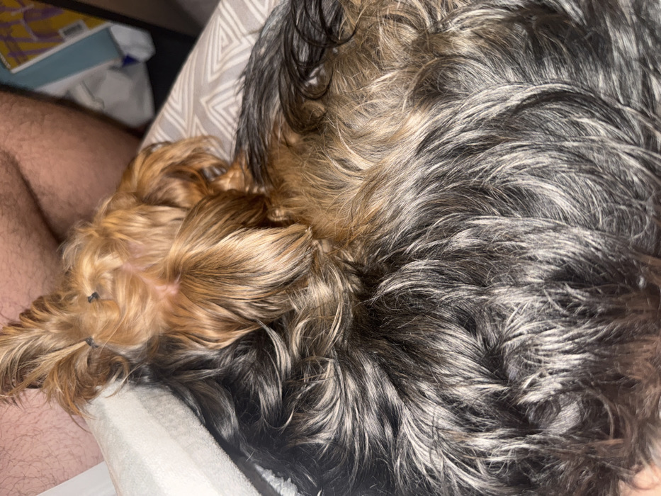 An indoor scene depicts a Yorkshire Terrier lying curled up