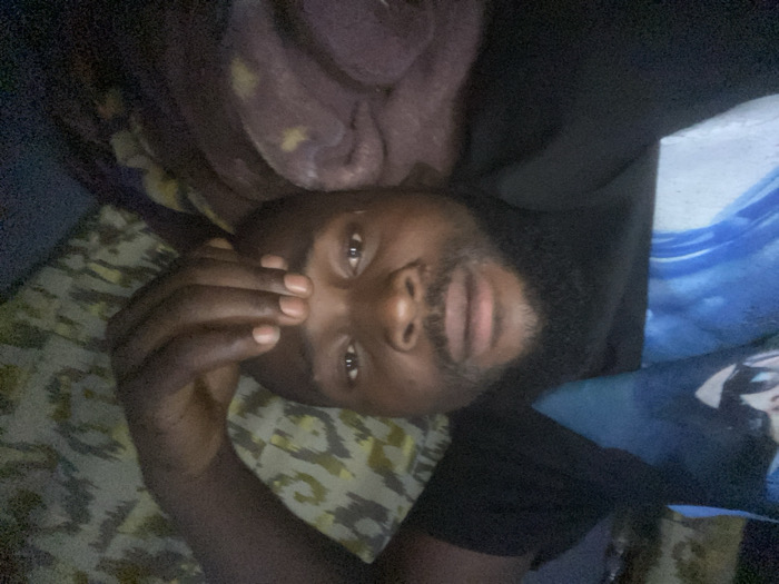 A man with dark skin, a beard, and dark eyes is lying down. His left hand is near his forehead. He wears a black shirt. The background consists of patterned bedding in shades of beige and brown on one side, and a blue and white patterned blanket on the other side. There is also a purple blanket visible in the top left corner.