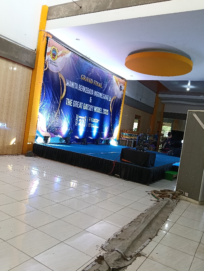 A stage is set for "Grand Final Wanita Berkebaya Indonesia Ke-III & The Great Gatsby Model 2025" with blue backdrop. A black speaker is present on the stage. Gold trophies sit on tables beside the stage. The event seems to be taking place indoors where the floor is tiled with white squares. In the foreground, there is debris on the floor. A yellow circular light fixture is visible on the ceiling.