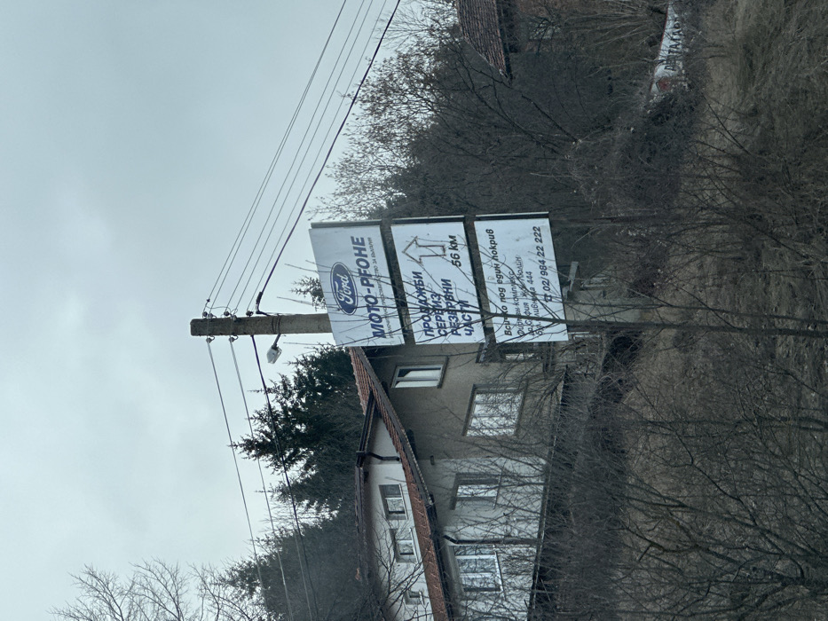 This image depicts an outdoor scene under an overcast sky, characteristic of a mountainous or semi-rural area, identifiable as in or near Gintsi, Bulgaria. The central subject is a tall, dark gray concrete utility pole positioned slightly right of center, supporting multiple horizontal power lines and a street light fixture. Attached to this pole is a vertical multi-panel billboard. The top panel features the Ford logo and "MOTO-PFOHE," with smaller Cyrillic text indicating "Exclusive Representation for Bulgaria." The middle panel displays "ПРОДАЖБИ СЕРВИЗ РЕЗЕРВНИ ЧАСТИ" (Sales Service Spare Parts), an upward arrow, and "56 КМ" (56 KM). The bottom panel reads "ВСИЧКО ПОД ЕДИН ПОКРИВ" (Everything under one roof), followed by "Фирмен комплекс" (Company complex), "бул. Царица Йоанна 444" (Tsaritsa Ioanna Blvd 444), and a phone number "02/984 22 22," indicating a Ford dealership in Sofia located 56 kilometers from the sign's position. To the left of the utility pole and billboard, a two-story residential building with light-colored walls and a brown tiled roof is visible, set back on a slight incline. It features multiple windows with white frames and a visible gutter system. The foreground is dominated by bare deciduous trees and shrubs, suggesting late autumn, winter, or early spring. Behind the residential building, a dense stand of dark green coniferous trees covers a higher slope. On the far right, a portion of another building with a tiled roof is partially visible. In the lower right quadrant, partially obscured by bare vegetation, a white cylindrical object with the Cyrillic text "ДЕЛТА ГАЗ" (DELTA GAS) is present on the ground. No individuals are visible in the scene.