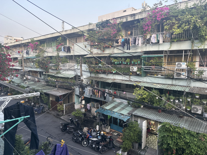 A bustling urban scene shows a multi-story building with balconies adorned with vibrant flowers and lush greenery. Clotheslines are strung across balconies. Below, a narrow street is filled with parked motorcycles. Electrical wires crisscross overhead, adding to the chaotic yet lively atmosphere. The scene is captured from an elevated perspective, looking down upon the building and street.