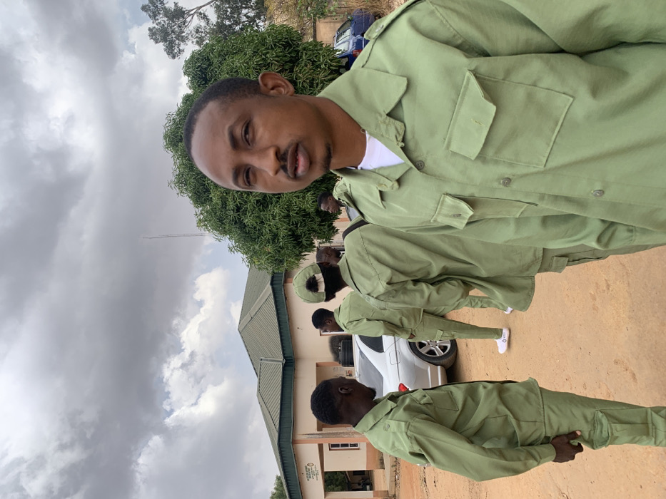 The image captures an outdoor scene in Bukuru, Nigeria, under an overcast sky dominated by grey clouds. In the immediate foreground, a male subject of African descent stands facing the camera directly. He has short dark hair, a mustache, and a short beard, and wears a light olive green collared shirt with two breast pockets over a white undershirt. In the midground, behind the foreground subject, three other males are visible. All are dressed in matching light olive green uniforms consisting of long-sleeved collared shirts and cargo pants. One individual, positioned to the left, is seen from the back-left with his left hand in his pants pocket. Another, central in the midground, is seen from the back, wearing white sneakers. A third, to the right, is seen from the back-right, wearing a light olive green baseball cap backward. Two additional individuals in similar uniforms are partially visible in the distant right background. The background features a light-colored building with a dark green pitched roof. The building has windows and an arched entryway; a sign is affixed to its left facade. A tall, thin metal pole extends vertically from behind the building's roof. To the left of the building, a silver sedan is parked, with its rear passenger side visible. A large, dense green tree is prominent on the right side of the background, partially obscuring a dark blue vehicle parked further back. The ground surface is unpaved, composed of reddish-brown dirt.