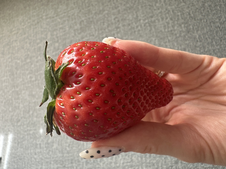 In Wanneperveen, Netherlands, a close-up image displays a single, large, ripe strawberry held in a human right hand. The strawberry is predominantly red, conical in shape, with a slightly textured surface marked by numerous small, light-colored achenes. A green calyx with several sepals is visible at the top of the fruit. The hand, visible from the palm side, supports the strawberry with the thumb on the left and the index finger on the right. The fingernails are elongated and adorned with a light base color and dark polka dots. A ring with a metallic band and a small stone is present on the ring finger. The background is a uniformly blurred, light-grey textured surface.