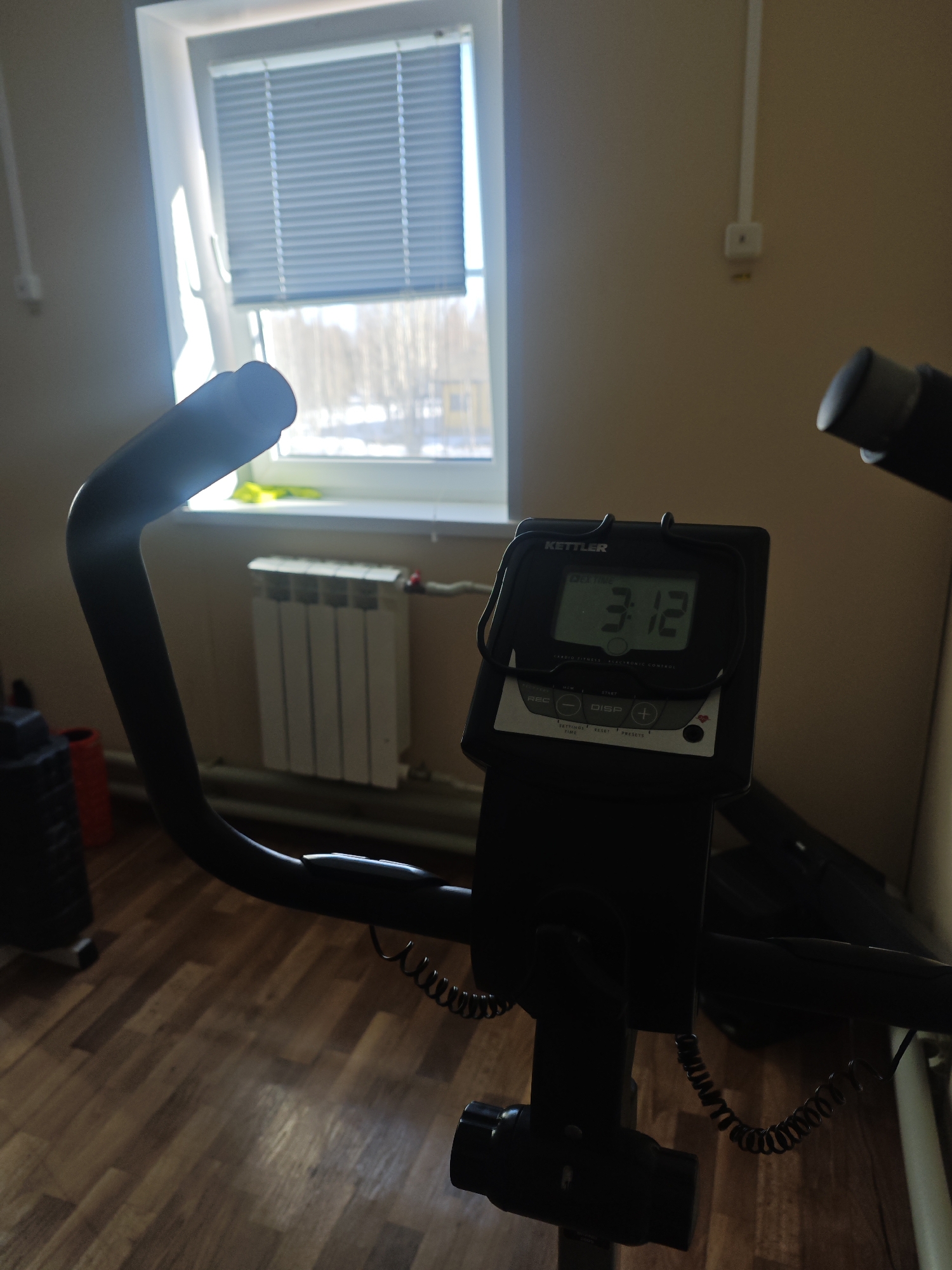 Kettler exercise bike in what appears to be a room with light-colored walls and a wooden floor. The bike's display reads "3:12". A window with closed blinds is visible in the background, and a radiator is positioned beneath it. The location is identified as the city of Unknown, Russia.