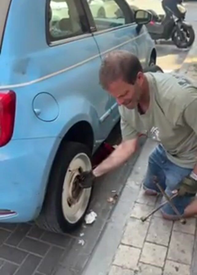 A middle-aged white man is kneeling on the sidewalk next to a light blue Fiat 500 car that has a flat tire. He is wearing a short-sleeved t-shirt, denim shorts, and brown work boots. He is smiling and appears to be looking at the camera as he touches the exposed hub of the wheel. A tire iron is on the ground next to him. The car is raised on a jack. A white cloth is visible near the wheel. The scene is set on a paved sidewalk next to a street in a residential area, with buildings visible in the background and a scooter parked nearby.