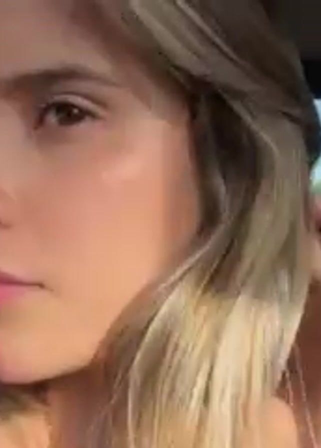 A fair-skinned young woman with light brown and blonde highlighted hair is sitting in the driver's seat of a car. She is looking to her left, and her right hand is briefly running through the right side of her hair. The car appears to be in motion and is moving through a sunny area with trees. The woman is wearing a dark tank top with a thin strap.