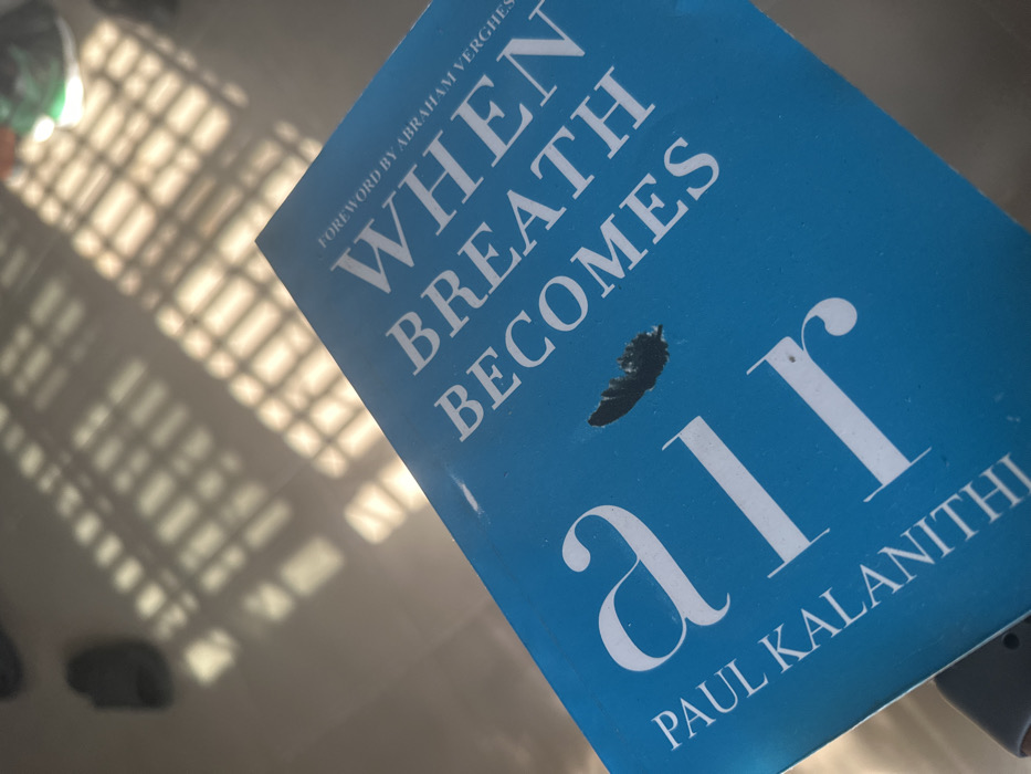 A copy of "When Breath Becomes Air" by Paul Kalanithi lies tilted on a surface