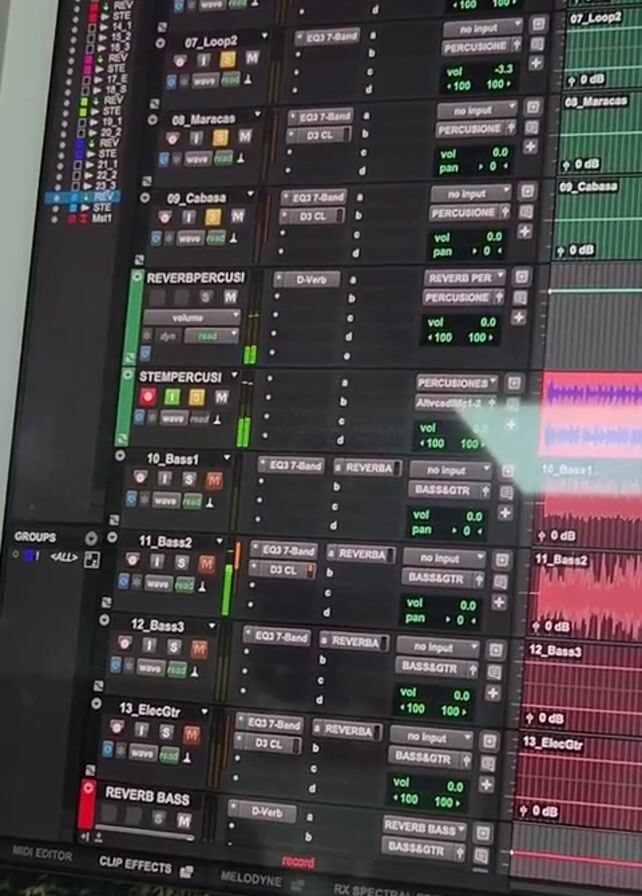 computer screen displaying music editing software. The left side of the screen shows a vertical list of sound tracks, labeled with names like "Loop1", "Maracas", "Bass1", "ElecGtr", and others. To the right of the track names are columns for inserts, sends, and input/output. The right side of the screen displays the tracks in waveform format, with red and green colors differentiating the tracks. A vertical white line indicates the current playback position. The software interface also includes controls for volume, panning, and effects. The software is likely used for music production and sound editing. The screen is slightly tilted and reflects light.
