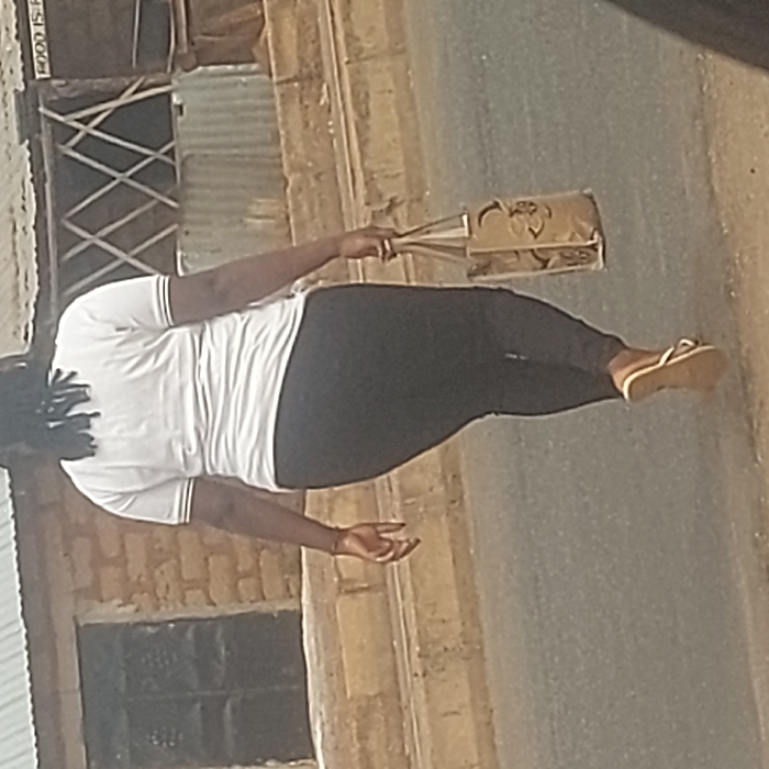 A woman with black dreadlocks is walking on a street. She is wearing a white short-sleeved shirt with dark trim, black leggings, and tan sandals. She is carrying a light brown handbag with dark embellishments and handle. The background includes a corrugated metal wall with a window and a building. The lighting is bright, suggesting daylight. The image is slightly tilted.