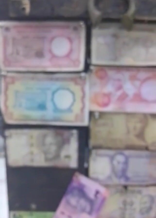 collection of international banknotes displayed on a dark-colored board. The banknotes are various colors, including pink, blue, green, and beige. Some banknotes have portraits printed on them. The camera pans slowly across the display, gradually bringing the banknotes into focus. The lighting is somewhat dim, and the resolution is low, making it difficult to clearly identify the denominations or specific countries of origin. There's a blurry white surface visible at the bottom, likely a table or counter.