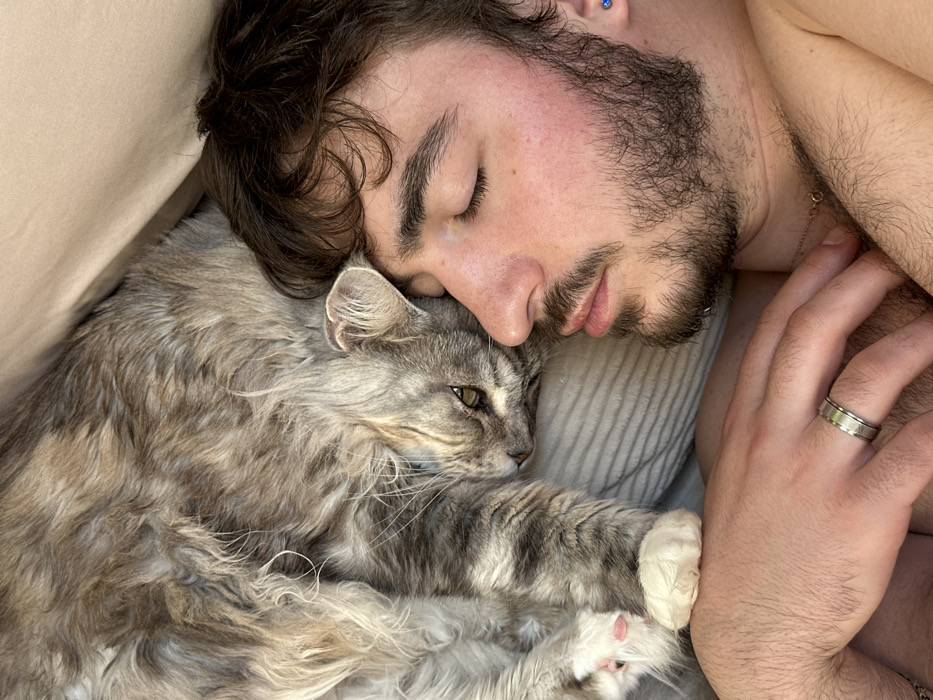 - "A close-up photograph taken in Kommunarka, Russia, depicts an adult male resting alongside a domestic cat on soft bedding" by FM-CL1813, licensed under CC BY 4.0