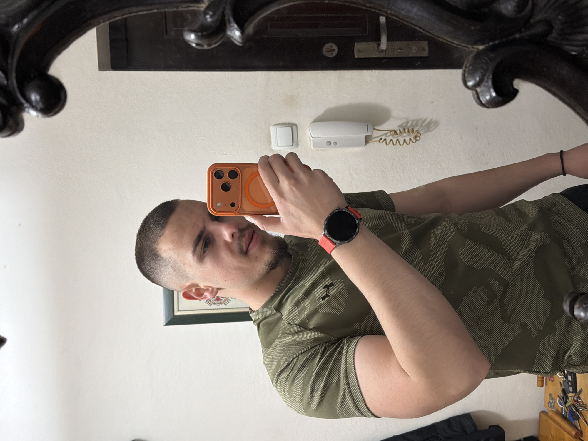 A young man is taking a selfie in a mirror. He is holding an orange iPhone with a MagSafe ring in his right hand. He has a short haircut and stubble. He is wearing a green camo-patterned t-shirt with the Under Armour logo and a red smartwatch on his left wrist. The mirror has an ornate dark-colored frame. Reflected in the background is a white wall with a light switch, a white intercom phone with a coiled cord, and a dark rectangular object above them. A framed picture is partially visible on the wall near the man's head. In the lower right corner, a wooden dresser with keys hanging on it is partially visible. Based on the user's request, the location is assumed to be in Peshtera, Bulgaria, although no elements in the image explicitly confirm this.