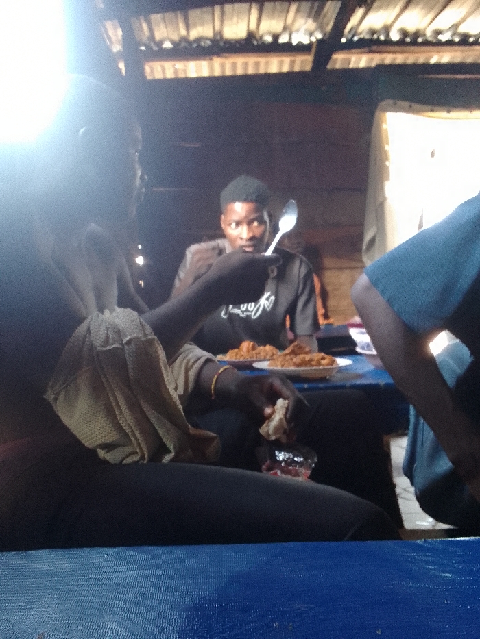 Location: Unknown, Unknown. The scene is an interior, dimly lit dining area. The ceiling structure reveals corrugated metal roofing, and the walls are constructed from wooden planks. A blue-surfaced table occupies the foreground. Three individuals are partially visible, seated around this table. On the left, a person with dark skin, dressed in a light-colored top and dark trousers, holds a silver spoon in their raised left hand, which is partially obscured by a strong, overexposed light source. Their right hand, adorned with a gold-colored bracelet, holds a piece of light-colored bread over a small, dark container. A beige, textured cloth is draped over their lap. Directly opposite, in the mid-ground, a second male individual with dark skin and short dark hair is seated, wearing a dark t-shirt with white text. He is observing the foreground. Between these two, two white plates hold portions of a reddish-brown, possibly rice-based meal. On the right, the arm and partial torso of a third person, wearing a blue short-sleeved garment, are visible. The ambient light is low, accentuated by a prominent glare from the left side of the frame.