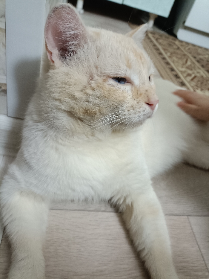 A light-colored cat, possibly a Siamese mix, rests on a light-colored wood floor. Its fur is predominantly white with light tan markings on its face, ears, and around its eyes. The cat has piercing blue eyes and a pink nose. A hand is gently petting the cat's back. A cabinet and an area rug are visible in the background. The cat appears relaxed and content.