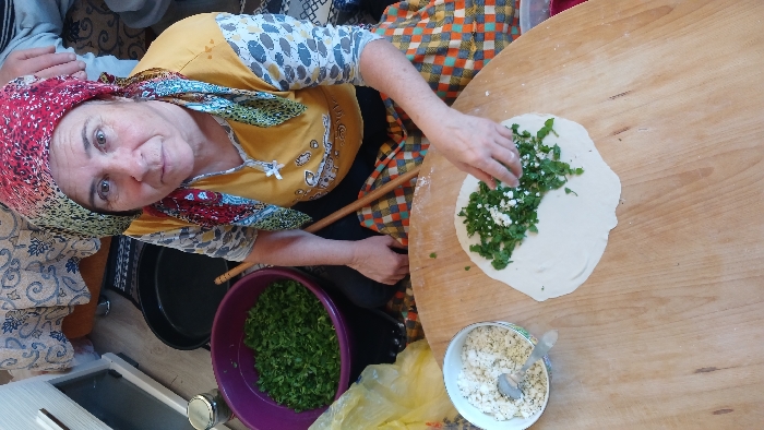 An overhead shot shows a woman preparing food. She wears a headscarf and a yellow top with patterned sleeves. She is seated at a large round wooden table, spreading a mixture of greens and white cheese onto a circular piece of dough. A purple bowl filled with greens and a white bowl of cheese are nearby. A wooden rolling pin rests on the table.