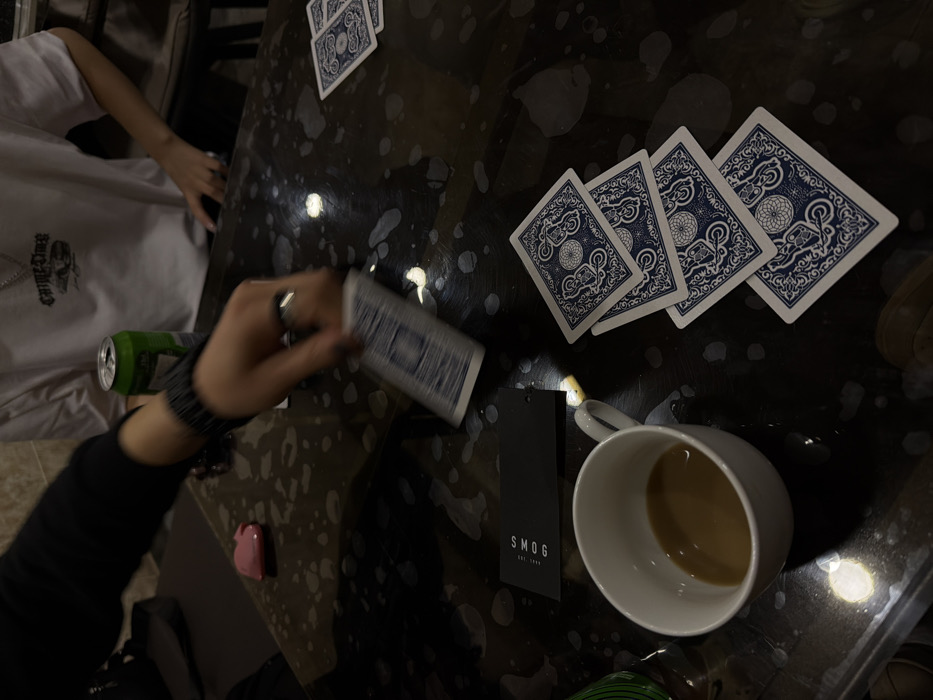 A person is seen shuffling playing cards on a reflective black table. Four cards are face-up in the upper right. A can, a ring, a tag that reads "SMOG est. 1989," and a half-empty white coffee mug also sit on the table. A small pink heart is visible near the can. The scene appears to be indoors with dim lighting.