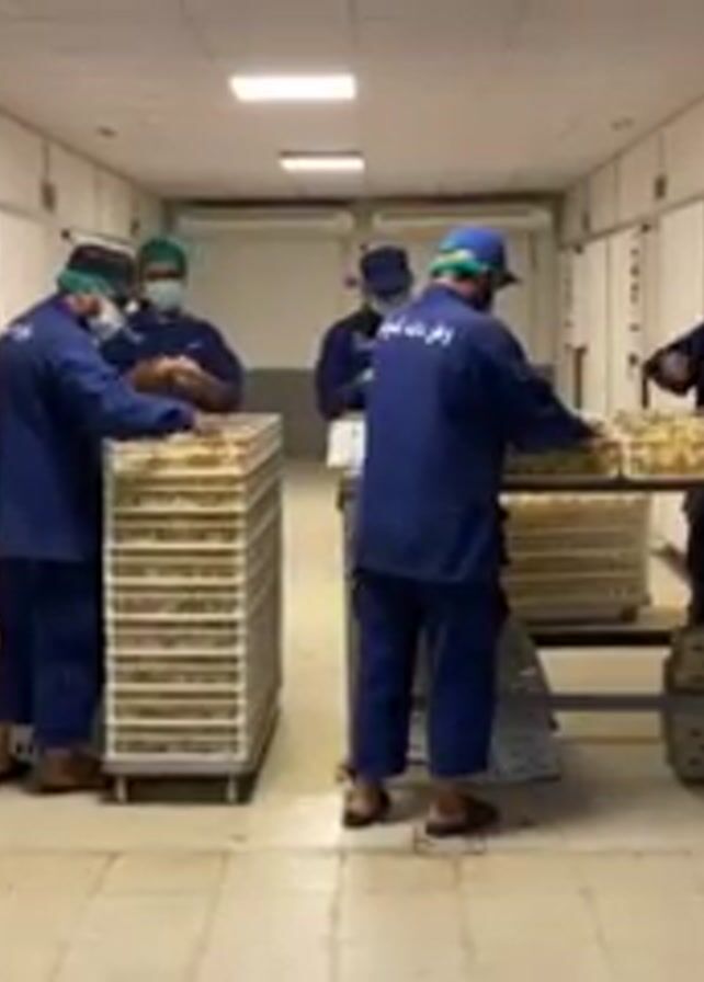Here is a detailed description of the video scene: **Scene Overview:** The video captures the interior of what appears to be a commercial hatchery. The setting is a long, brightly lit hallway with incubator units lining the left wall and shelves stacked with cardboard boxes on the right. **People:** There are multiple people present in the scene. * Five to six individuals are wearing dark blue uniforms with logos or text (possibly in Arabic) on the back, suggesting they are workers. They also have surgical masks on their faces and either hairnets or caps on their heads. * One person is standing near the left wall wearing traditional clothing (a long tan robe or Thobe) and a surgical mask. **Objects:** * **Incubator Units:** The left wall is lined with large, white incubator units. These likely contain eggs undergoing incubation. * **Trays of Chicks:** Several trays filled with recently hatched chicks are stacked on rolling carts and on a metal shelving unit. The chicks are small and yellow. * **Cardboard Boxes:** The right side of the hallway is lined with shelves filled with stacked cardboard boxes. The boxes have branding or labeling on them. * **Metal Shelving Units:** One or more metal shelving units are visible, used to hold the trays of chicks. **Actions and Interactions:** * **Handling Chicks:** The workers in blue uniforms appear to be sorting, counting, or moving the newly hatched chicks from the trays into the cardboard boxes. They are actively engaged in handling the chicks. * **Observation:** The person in traditional clothing stands near the wall, seemingly observing the activities. * **Packing/Boxing:** The workers are involved in preparing the chicks for packaging or distribution, placing them in the boxes on the shelves. **Environment:** * **Hallway:** The scene takes place within a narrow hallway, likely within a larger facility. * **Lighting:** The hallway is brightly lit with fluorescent or LED lighting. * **Cleanliness:** The environment seems clean and sterile, consistent with a hatchery environment. * **Color Palette:** The color scheme is predominantly white, blue, and yellow due to the incubator units, uniforms, and chicks.
