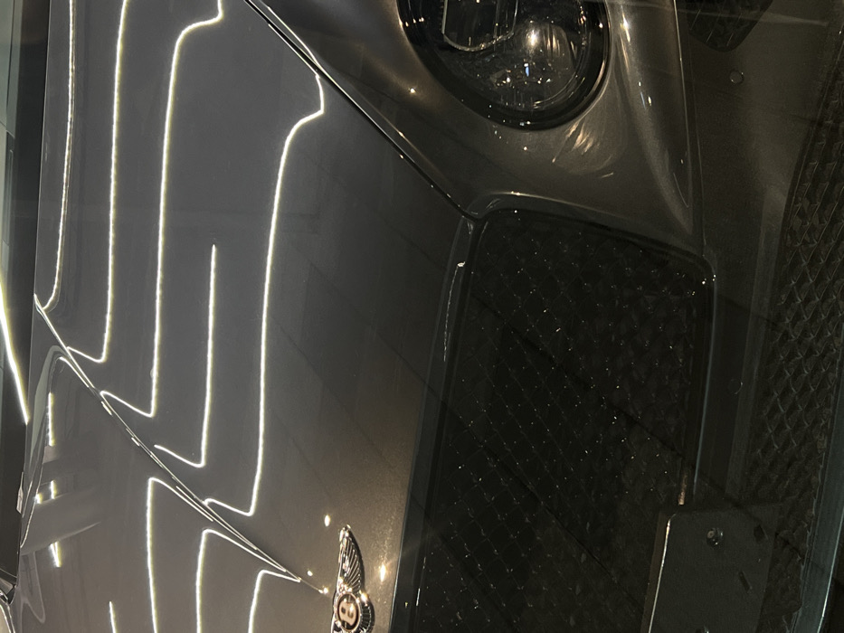 A close-up shot shows the front of a gray Bentley. The iconic winged "B" emblem is visible near the bottom. The distinct rounded headlight is prominent at the top. Reflected lights create stark, linear patterns on the hood. A black, mesh-like grill is also visible on the right, adding texture and contrast.
