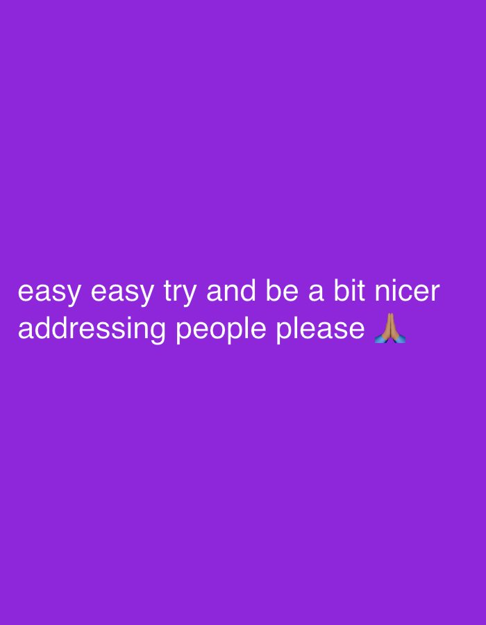 The image is a purple background with the text "easy easy try and be a bit nicer addressing people please 🙏" in white