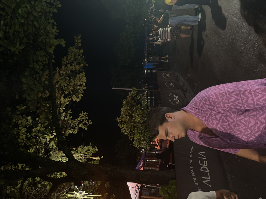 A nighttime outdoor scene shows a young man in a purple patterned shirt. He appears to be at an event with a crowd and black banners with white text. A tree with sparse leaves is to his left. The background suggests a concert or gathering with visible stage equipment and dim lighting. The ground looks damp or wet. The image is rotated 90 degrees.