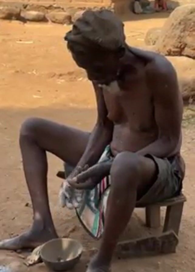 An elderly, shirtless, dark-skinned man sits on a low stool outdoors, grinding something in his hands