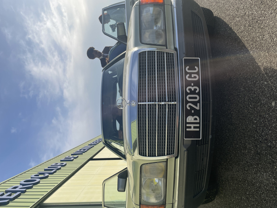 The image captures a light green Mercedes-Benz sedan, model W126 S-Class, with French license plate "HB-203-GC," parked on dark asphalt