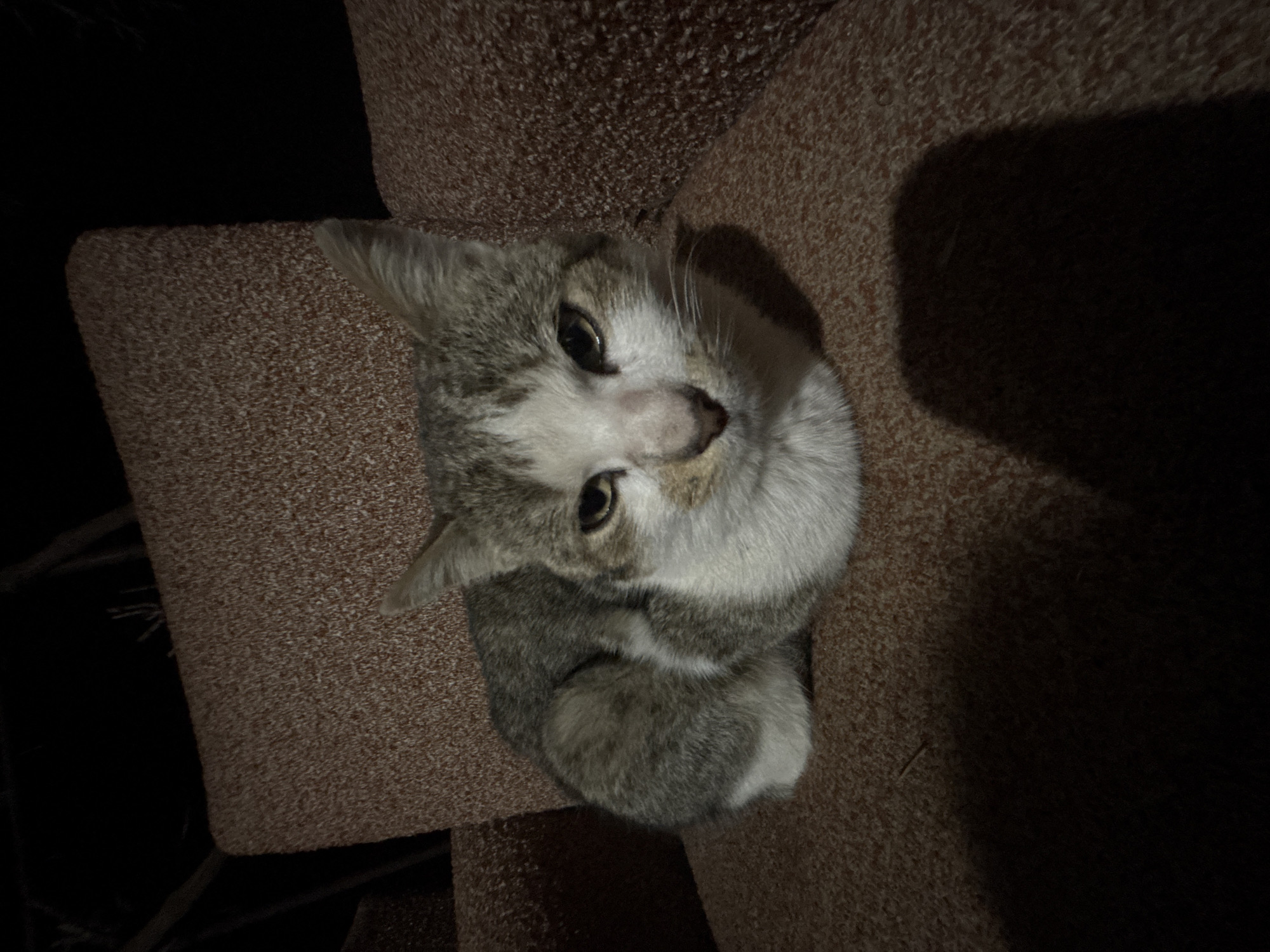In Slavyanovo, Bulgaria, a white and gray tabby cat is resting in a loaf position on a reddish-brown, mottled upholstered chair. The cat's face and chest are white, while its back and ears display gray tabby patterns, accented by a small tan patch near its nose. It gazes directly at the camera with amber-brown eyes. The environment is dimly lit, with a frontal light source originating from the left, casting a distinct shadow from the cat onto the chair's textured fabric. The background behind the chair is largely obscured by darkness.