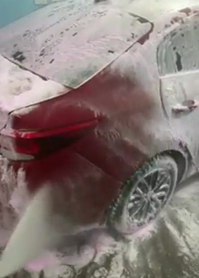 red car being washed at a car wash. The car is covered in pink soapy foam. A high-pressure water nozzle is being used to rinse off the foam, starting from the rear of the car and moving along the side. The car has black rims. The car wash appears to be indoors, as there is a sign visible in the background.