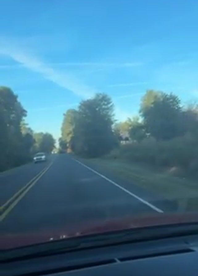 The video is taken from inside a moving car, looking out through the windshield. The car is driving on a two-lane road, with yellow lines dividing the lanes. The sky is a clear blue with some wispy clouds. Trees line both sides of the road. Another car is visible in the distance, approaching from the opposite direction. The dashboard of the car taking the video is visible at the bottom of the frame. The overall scene depicts a drive on a sunny day on a rural road.