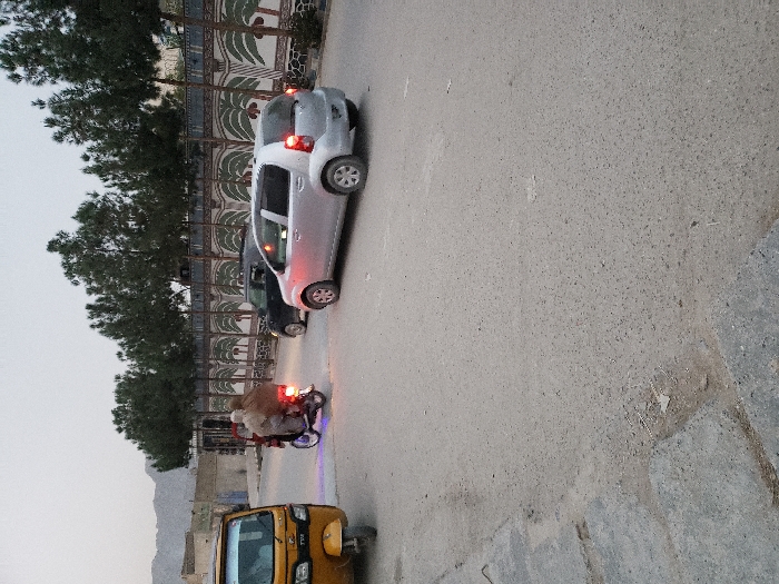 A street scene features a yellow auto-rickshaw in the foreground. Behind it, a man rides a motorcycle, followed by two cars: a dark-colored one and a silver compact vehicle. Trees and a decorative wall run along the edge of the road, providing a backdrop to the vehicles. The sky appears overcast, suggesting either early morning or late afternoon. The pavement is a mixture of smooth and rough surfaces, typical of urban streets.