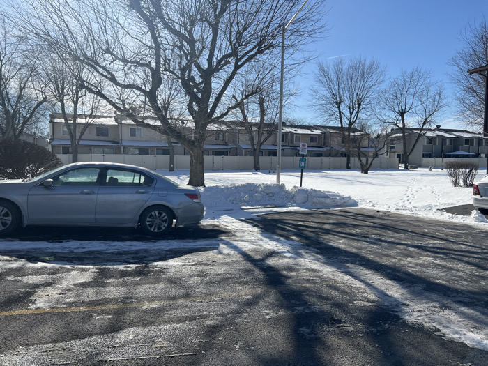 A silver sedan parks on a paved lot alongside a snow-covered area. In the background, a row of townhouses with white fences lines the horizon. Bare trees stand between the car and the buildings. A parking sign and post rise from a snow pile near the right edge of the parking lot, casting long shadows across the frame. The sky is clear and blue.