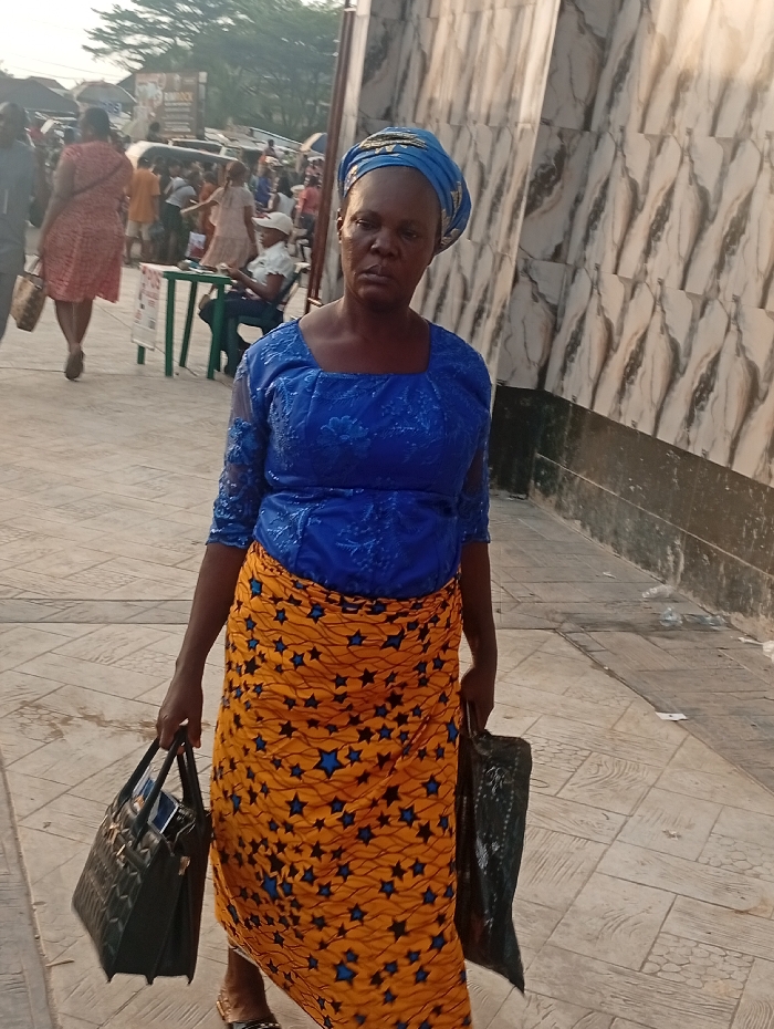 The image portrays an outdoor urban scene in the city of Umuode, Nigeria, under daylight conditions. The primary subject, an adult female of African descent, stands prominently in the foreground, facing the viewer with a neutral expression. She is adorned in a blue headwrap with gold trim, a royal blue long-sleeved top with textured embroidery, and a long orange wrapper skirt patterned with numerous blue stars. She carries a black structured handbag in her left hand and a dark, crinkled plastic bag in her right hand. To her right, a building wall exhibits a distinctive beige and brown wavy or marble-like pattern. The ground beneath is paved with light-colored, patterned tiles, with some scattered litter visible near the wall. In the mid-ground and background, a bustling street or market area is visible. Several pedestrians are present, including a woman in a reddish-orange patterned dress walking away from the camera, and a man in a white cap seated at a small green table with a white sign. Further in the background, indistinct vehicles and trees are visible against a bright sky.