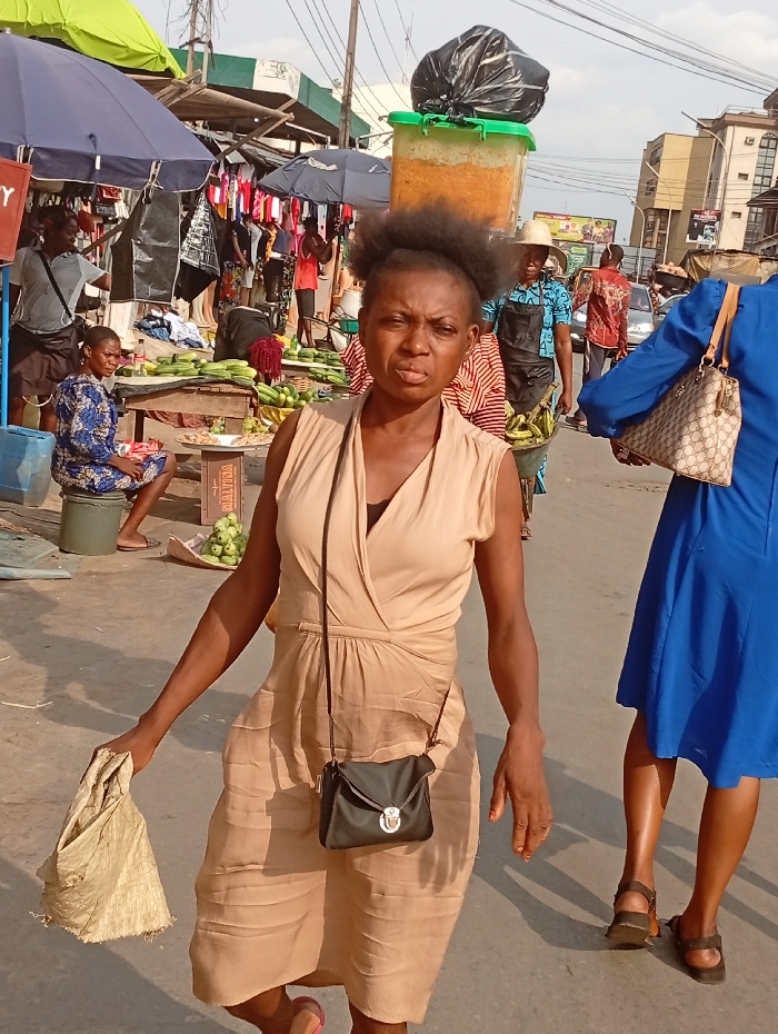 A woman in a beige dress and black purse walks toward the camera, carrying a woven bag. She has short, dark, puffy hair. Behind her, a bustling outdoor market is visible, with vendors under umbrellas selling produce. Another vendor carries a large container on their head with a bag on top. Additional people are shopping and walking.