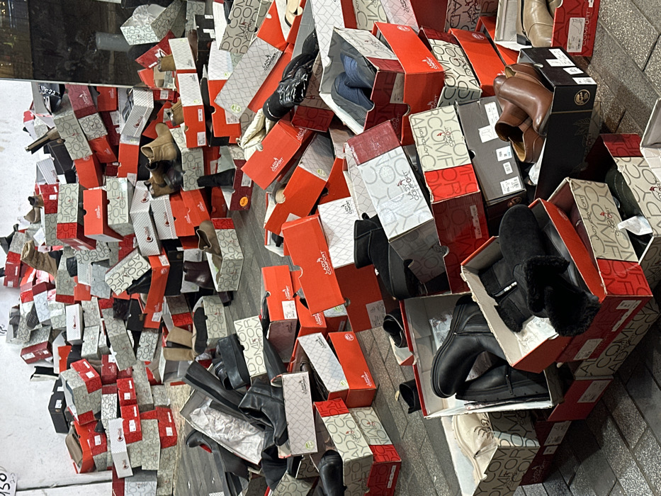 - "The image displays a large, chaotic pile of retail shoe boxes and assorted footwear outdoors on a paved surface in Tel Aviv, Israel" by FM-jqiIm2, licensed under CC BY 4.0