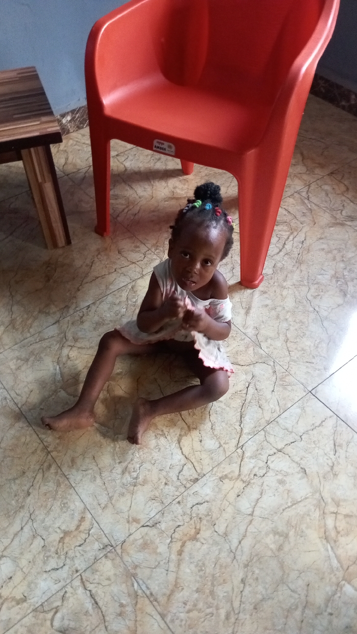 - "A young girl sits on a tiled floor next to a red plastic chair and a small wooden table" by FM-1O94j1, licensed under CC BY 4.0