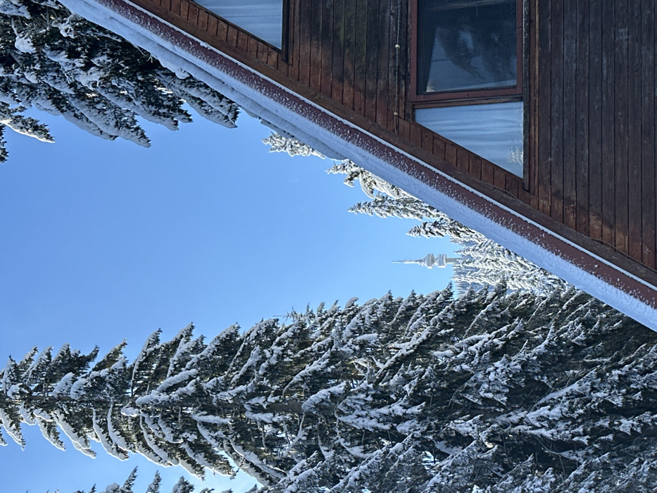 An outdoor scene in Stoikite, Bulgaria, on a clear, sunny winter day. The foreground features a portion of an A-frame wooden cabin on the right, displaying dark brown horizontal wood siding. Its steeply sloped roof, covered in a thick layer of white snow, descends from the top right towards the bottom center. A triangular window is visible under the roofline, above a rectangular window below it, both reflecting ambient light. To the left and in the mid-ground, numerous tall evergreen trees are heavily laden with white snow, suggesting recent snowfall. In the background, centered between the trees and the cabin, the distinctive white and gray structure of the Snezhanka TV Tower is visible atop a snow-covered hill, surrounded by more snow-covered evergreens. The sky is clear and bright blue. No individuals or specific actions are depicted.
