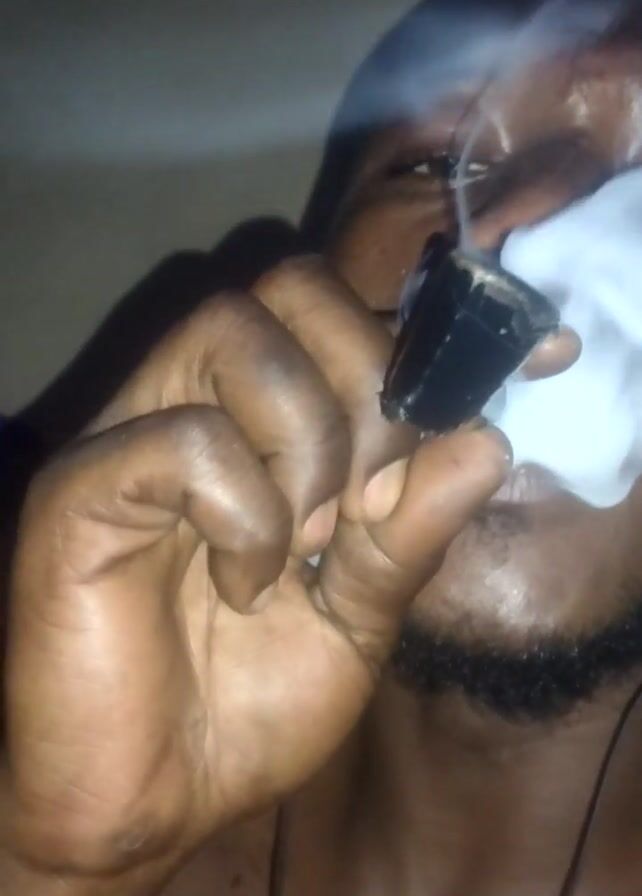 A person with dark skin is exhaling a large cloud of smoke from a short, dark-colored pipe or smoking device held in their right hand