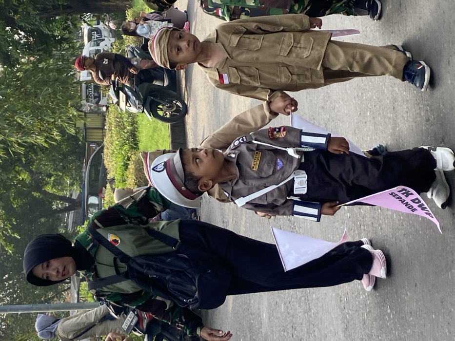Two children, one dressed in a brown military uniform and the other as a police officer with a white helmet, hold hands. They stand on a road with several other individuals. The child in the police uniform holds a flag. A woman wearing a camouflage jacket and a hijab stands to the side. There are several motorbikes and vehicles in the background.