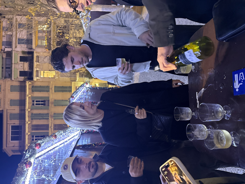A group gathers outdoors, possibly at a holiday market, with festive decorations visible in the background. People are dressed in casual attire; one wears a white baseball cap, another a light-colored jacket. Wine is being poured from a green bottle into glasses on a dark surface. A phone captures the moment. The backdrop features multi-story buildings with muted tones and illuminated windows.