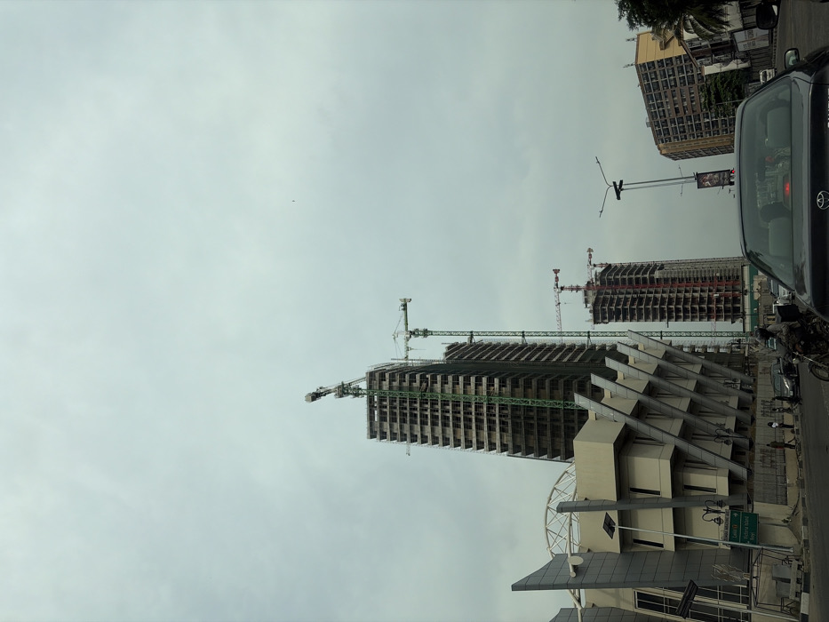 The image depicts an urban street scene under an overcast, light grey sky. The location is the city of Itirin, Nigeria, with a visible road sign indicating "LAGOS WELCOME AREA," "Lekki," "Federal Secretariat," and "Ikoyi." In the foreground, a dark-colored sedan (identified as a Toyota Camry by its rear emblem) is positioned from the lower right, facing away from the viewer, with its rear bumper, trunk, and rear window visible. To its immediate left, a motorcycle with a rider is partially visible in a traffic lane. Several other vehicles are discernible further down the multi-lane road. On the left side of the image, a contemporary multi-story building with a distinctive architectural design is prominent. It features dark paneling, light-colored angled supports or decorative elements, and a white, open-frame structure on its roof. A green road sign is mounted near the base of this building. Several individuals are visible standing or walking on the sidewalk adjacent to this structure. The central and mid-ground of the image are dominated by three high-rise buildings under construction. The tallest of these, on the left, is an exposed concrete frame structure with multiple floors, extensive scaffolding, and a large green tower crane attached to its side, extending above the building. To its right, a second, slightly shorter building also under construction displays an exposed concrete frame and has a green tower crane positioned next to it. Further to the right and slightly behind, a third construction site is visible, featuring a red tower crane. On the far right, an older, multi-story building with a yellowish-brown facade and numerous windows is visible, appearing fully constructed. Overhead, tall black streetlight poles with multiple arms are present, one of which has an attached banner. The sky occupies the upper two-thirds of the image, displaying uniform light grey cloud cover. A small, dark speck is faintly visible in the upper right portion of the sky.