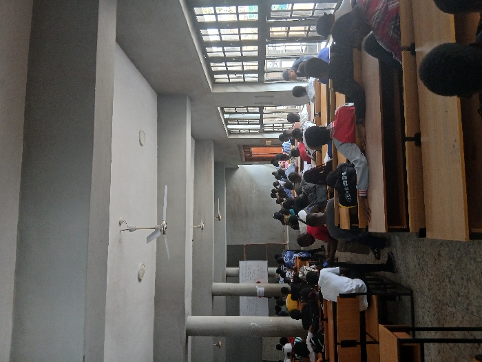 The image displays a large, utilitarian lecture hall or classroom, consistent with institutional architecture, likely located within a university or college campus in Lagos, Nigeria