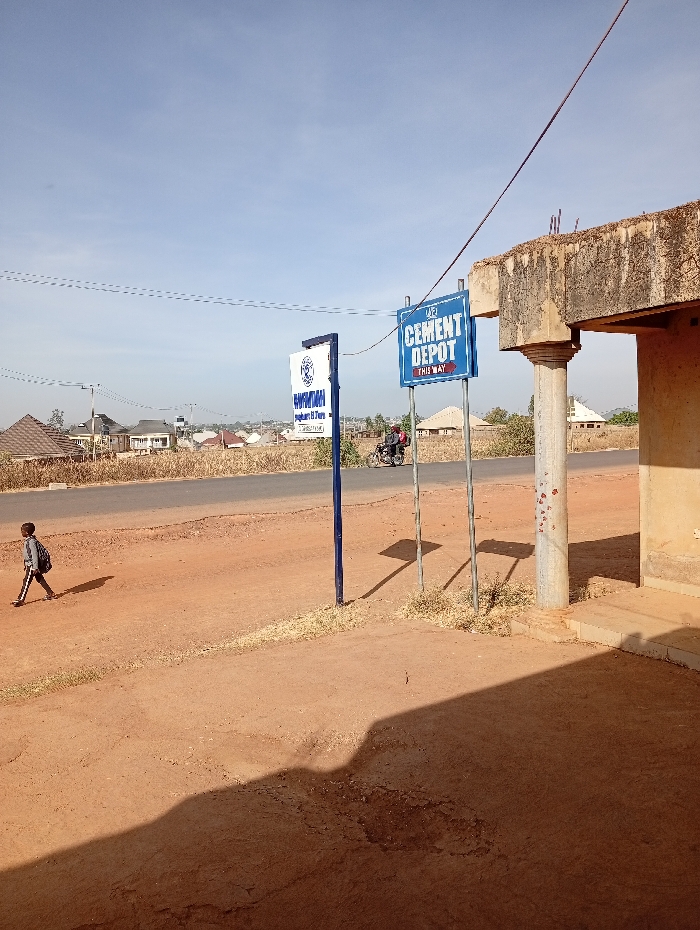 The scene depicts a sunny outdoor environment in Barakin Sabawa, Nigeria. The foreground consists of reddish-brown dirt ground with a large, dark shadow extending from the lower right. A young individual, dressed in a grey top and dark trousers, walks from left to right across the dirt path, carrying a dark backpack. In the midground, an asphalt road runs horizontally. Adjacent to the road, two blue-and-white signs are mounted on poles. The left sign displays "RAYYANAH INTERNATIONAL NURSERY & PRIMARY SCHOOL" with a circular logo. The right sign reads "U.F.I CEMENT DEPOT THIS WAY" with a white arrow pointing right. Behind these signs, a person on a motorcycle is visible on the road. To the far right, a weathered concrete structure with a cylindrical pillar, showing exposed rebar on its upper surface, partially frames the scene. The background features numerous single-story residential buildings with various roof types, indicating a populated area, under a clear blue sky. Overhead, multiple power lines traverse the upper portion of the frame.