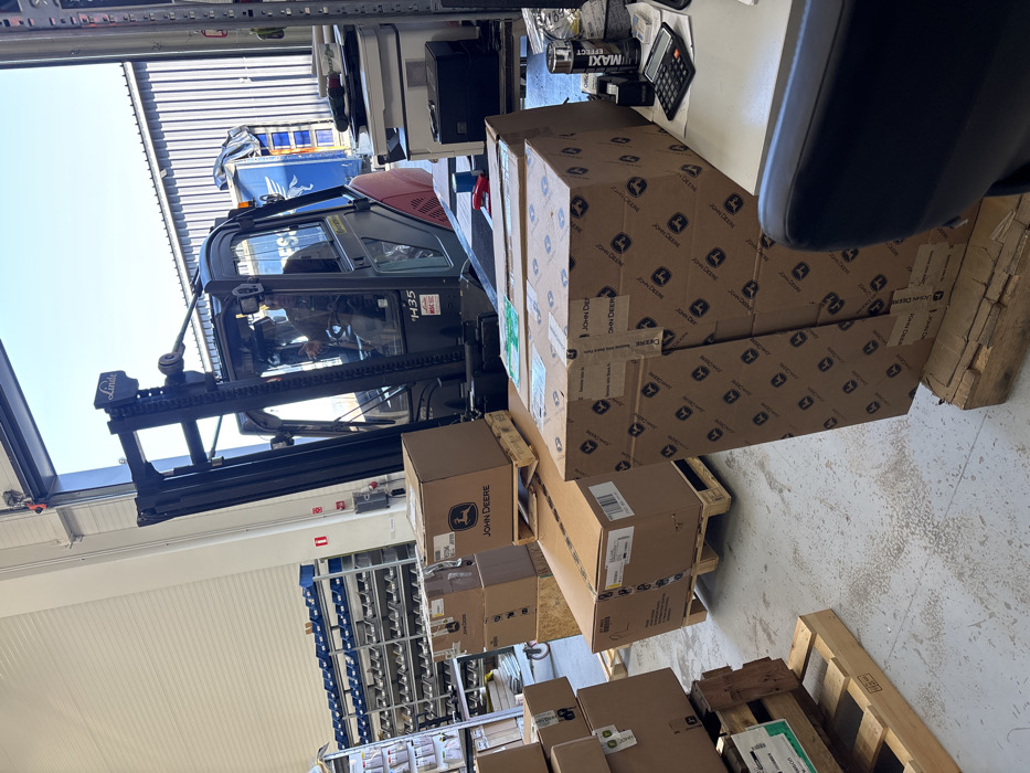 The scene depicts an industrial warehouse interior in Montana, Bulgaria, with an open bay door leading to an exterior area. In the mid-ground, a dark-colored Linde H35 forklift is positioned partially within the building, near the open bay door. A male individual is seated inside the forklift's cab, with his right arm visible, suggesting operation of controls. Outside the bay door, the rear portion of a blue truck or trailer with a white graphic is visible under clear daylight. Inside the warehouse, numerous cardboard boxes are stacked on wooden pallets across the light-colored concrete floor. Many of these boxes prominently display the "JOHN DEERE" logo. A large stack of "JOHN DEERE" branded boxes on a pallet occupies the immediate foreground, situated adjacent to a white desk. The desk is furnished with a black calculator, a silver aerosol can labeled "MAXI MAX! EFFECT," and a white multifunction printer/scanner. A black office chair is partially visible on the right. Along the left wall of the warehouse, a multi-tiered metal shelving unit is visible, filled with numerous small blue storage bins. The warehouse interior features white corrugated metal walls and ceiling.