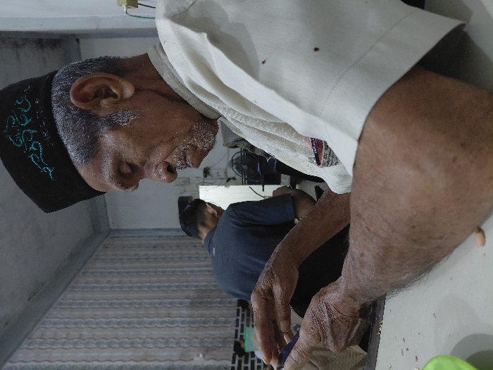 In an indoor setting in Mns Alue, Indonesia, an elderly male subject is depicted in profile, facing right and looking downwards