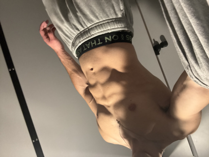 A shirtless male individual with a lean, muscular physique, displaying prominent abdominal muscles and defined biceps, is captured in a waist-up, angled photograph