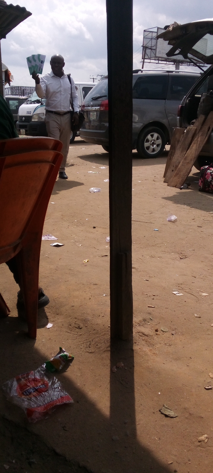 scene in Elelenwa, Nigeria, a town with coordinates 4.856 latitude and 7.068 longitude. A man in a white shirt is walking toward the right of the frame. He is holding a stack of green flyers in his left hand and is carrying a brown bag in his right. Behind him are two vehicles. The vehicle closer to the man is a white minivan with a license plate that reads "002." The vehicle further away is a dark grey minivan. The man's feet are on a dirt road that leads away from a large wooden pillar. The wooden pillar casts a shadow on the ground to the right. There is a bright orange plastic chair in the foreground with someone's foot visible in the chair's base. There is a piece of trash on the ground near the bottom of the frame, along with several other pieces of trash visible near the man. There is a sign in the background, but it is too blurry to read. The sky is cloudy. There are power lines in the background.