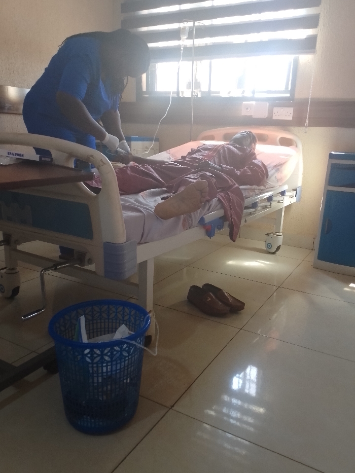 The scene depicts an interior view of what appears to be a hospital or medical examination room in Unknown, Unknown. **People:** - One individual, identifiable as a medical professional, is positioned on the left side of a hospital bed, leaning over the patient. This person wears blue medical scrubs and white examination gloves, with dark hair tied back. They are actively engaged in a medical procedure on the patient's right arm, which is extended. - A second individual, identified as a patient, is lying supine on the hospital bed, largely covered by a reddish-maroon blanket or gown. Their head is obscured by a pillow and blanket. The patient's right foot is visible and uncovered, extending towards the foreground. **Objects:** - A standard white hospital bed with adjustable features occupies the center. It has a white frame, white sheets, and a pillow. - An intravenous (IV) drip stand with a clear IV bag and tubing is visible above the bed, near the window. - A small, light-colored rolling medical cart or table, with "NORMATIV" branding, is situated next to the bed on the left. - On the floor, in the foreground, a blue plastic waste basket contains white paper-like waste items. - A pair of brown slip-on shoes rests on the light-colored tiled floor near the foot of the bed, to the right of the waste basket. - In the background, a large window with horizontal blinds is visible, emitting bright, natural light. Below the window, two power outlets are mounted on the wall. - To the far right, a partial view of a blue medical cabinet or nightstand is present. **Environment:** The room features light-colored walls and a reflective, light-colored tiled floor. Bright light from the window casts reflections on the floor and causes some glare in the image, indicating daytime conditions. The overall environment suggests a sterile medical setting.