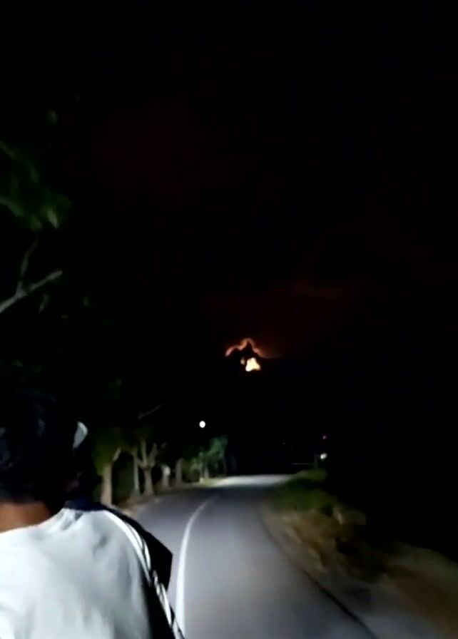 person walking down a narrow, winding road at night. The road is paved with a white dividing line, and trees line either side. The sky is dark, but there is a faint reddish glow above the treeline. The person in the video is wearing a light-colored shirt and a hat. The footage is shaky, suggesting that it was filmed while in motion. Street lights are visible further down the road.